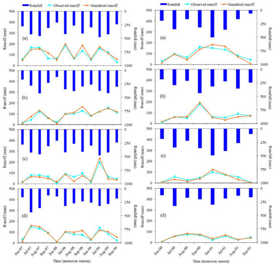 The graphical comparisons of the monthly measured and simulated runoff from the four watersheds (Barisam, Banikdih, Mahrand and Nagwan) are presented in Figure 3 for monsoon season during the calibration and validation periods. The figure shows that the magnitude and temporal variation of the simulated monthly runoff follow the pattern of measured runoff from the four watersheds during monsoon season. The results also show that during high rainfall in some months, the runoff is over- as well as slightly underestimated by the model for all four watersheds. This may be due to the low initial soil moisture and higher storage loss condition. However, the overall graphical comparison of the model’s performance is satisfactory, as indicated by the close agreement between the measured and simulated runoff from the four watersheds. In order to compare the model simulation with the measured counterpart, statistical analyses were performed during the calibration and validation periods.