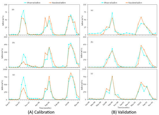 Measured and simulated monthly inflow during calibration and validation periods for (a) Konar, (b) Tenughat and (c) Panchet reservoirs.