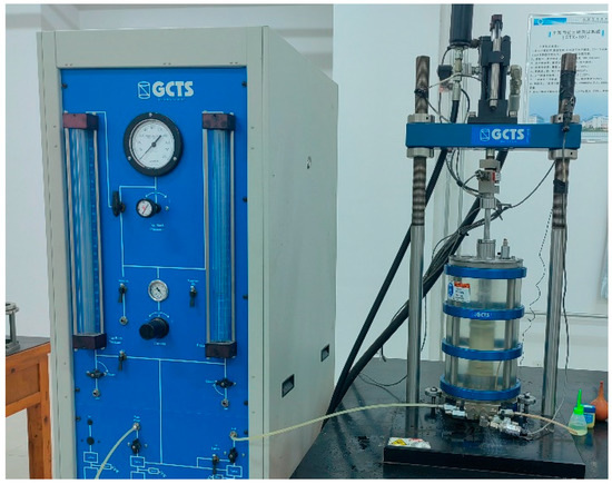 The experiments were conducted using a GCTS (Geotechnical Consulting & Testing Systems) triaxial testing system, as shown in Figure 1. The maximum confining pressure range is 2 MPa. The pore pressure sensor had a range of 0~2 MPa with an accuracy of 0.1 kPa. The displacement sensor had a range of 100 mm with an accuracy of 0.01 mm. The loading frequency ranged from 0 to 5 Hz. The loading waveforms included sine waves, square waves, and triangular waves.