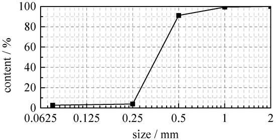 The test sand used in the experiment was obtained from a river sand deposit in Beijing, which belongs to medium sand. The particle size distribution curve of the sand is shown in Figure 2. From the particle size distribution curve, it can be observed that the proportion of medium sand with particle sizes ranging from 0.25 mm to 0.5 mm was 87.1%, and the content of fine sand with particle sizes smaller than 0.075 mm was 2.7%. The maximum dry density of the test sand was 1.61 g/cm3, and the minimum dry density was 1.43 g/cm3.