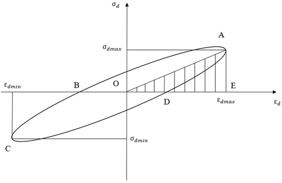 As shown in Figure 4 [31], the ideal stress–strain hysteresis loop is used to analyze the dynamic properties of the soil. The average slope of the hysteresis loop reflects the magnitude of the dynamic elastic modulus (Ed) under the current cyclic loading conditions, while the size of the hysteresis loop area reflects the energy dissipation during the loading and unloading processes. This energy dissipation is represented by the damping ratio of the specimen. The damping ratio of the soil reflects the lag exhibited by the stress–strain hysteresis loop under periodic dynamic loading conditions. The damping ratio and the dynamic elastic modulus (Ed) were calculated using the following formulas: