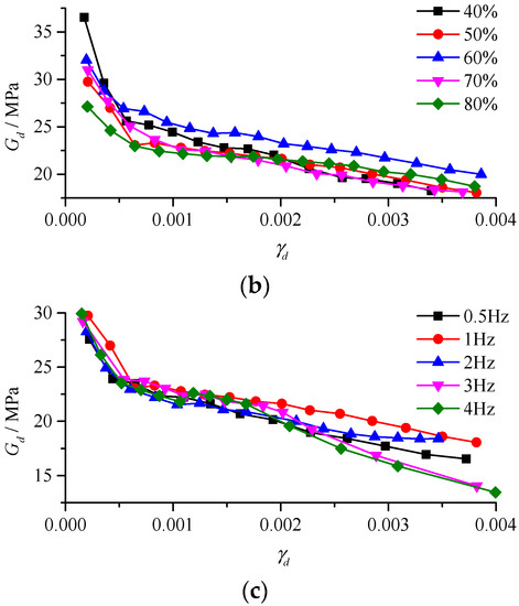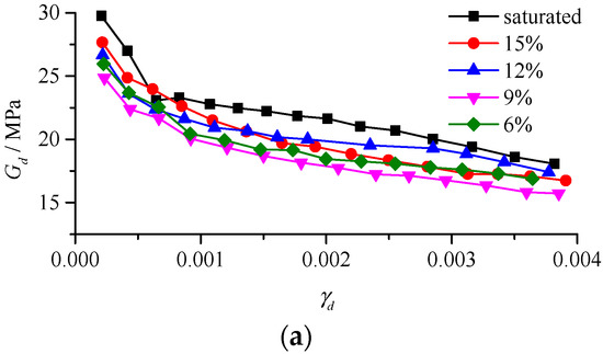 The dynamic shear modulus and damping ratio of the sand were analyzed based on the results of the graded loading tests. The average values of shear modulus and damping ratio were obtained by averaging the middle 10 hysteresis loops from the 20 cycles of each loading level. Figure 5a–c present the relationships between dynamic shear modulus and shear strain for different moisture contents, densities, and loading frequencies. The horizontal coordinate indicates shear strain γd and the vertical coordinate indicates shear modulus Gd. The results indicate that within the strain range of 10−4 to 10−2, the dynamic shear modulus of the sand decreases with increasing shear strain. The decrease is more pronounced within the strain range of 10−4 to 10−3, while it becomes slower within the strain range of 10−3 to 10−2. The results are consistent for different water content, compactness and loading frequency. It suggests that the strength of the sand rapidly decreases with increasing deformation at lower strains, while it tends to stabilize at higher strains. Figure 5a reveals that the dynamic shear modulus of the sand gradually decreases with increasing moisture content (with a moisture content of 20% for saturated specimens), indicating that an increase in moisture content enhances the strength of the soil. Figure 5b shows that an increase in density leads to a decrease in the dynamic shear modulus. Figure 5c demonstrates that the dynamic shear modulus of the specimens increases with an increase in loading frequency, indicating that the strength of the sand is lower under low-frequency seismic waves compared to high-frequency seismic waves.
