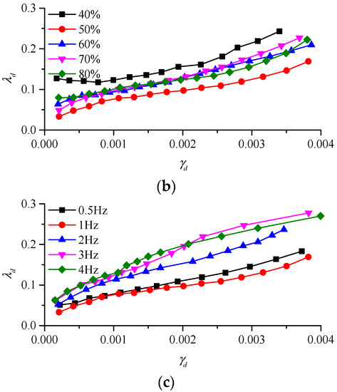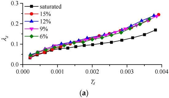 Figure 6a–c depict the relationship between the damping ratio and shear strain under different conditions of moisture content, compaction density, and loading frequency. The horizontal coordinate indicates shear strain γd and the vertical coordinate indicates the damping ratio λd. The results indicate that the trends of the damping ratio–shear strain () relationship are consistent across different conditions. Specifically, the damping ratio increases with increasing shear strain, reaching a minimum value of approximately 0.05 and a maximum value of 0.24. From the perspective of moisture content, the saturated samples exhibit lower damping ratios compared to unsaturated samples, while there is no significant difference in damping ratios among different moisture content conditions for the unsaturated samples. Regarding the compaction density of the samples, the highest damping ratio is observed in the sample with a density of 40%, while the sample with a density of 50% exhibits the lowest damping ratio. The damping ratio of samples with densities exceeding 50% increases with increasing compaction density. In terms of loading frequency, the damping ratio initially decreases and then increases with increasing frequency, with the minimum damping ratio occurring at a loading frequency of 1 Hz. There are notable differences in the damping ratios among samples subjected to different loading frequencies, indicating the correlation between the damping characteristics of the sand and the loading frequency, consistent with the characteristics of viscous damping.