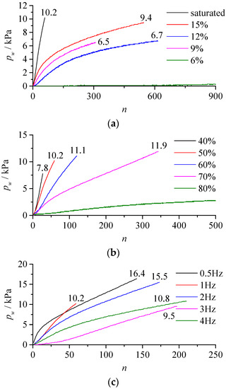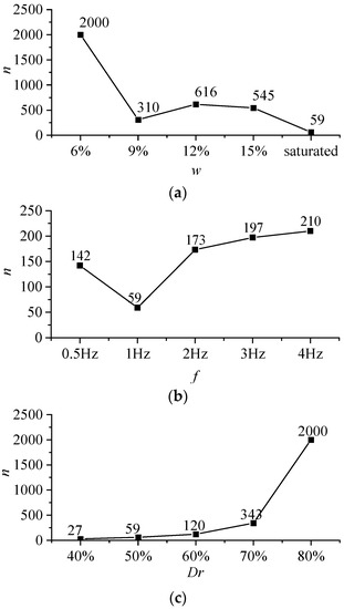 Samples under different conditions, labeled as 1B to 13B, were subjected to cyclic loading until failure under fixed confining pressure and deviatoric stress. The number of cycles at failure reflects the liquefaction resistance of the specimens. Figure 8 illustrates the variation of the number of cycles () at 5% axial strain for different combinations of water content (), relative density (), and loading frequency (). The numbers in the figure represent the number of cycles at which the axial strain reaches 5%. It should be noted that, in the case of 6% water content and the case of 80% density, the axial strain did not reach 5% even after 2000 cycles, indicating no occurrence of failure. From the perspective of water content, an increase in water content leads to a gradual reduction in the number of cycles, indicating that higher water content makes the sand more prone to liquefaction. It is worth noting that the number of cyclic loadings under 9% moisture content condition is lower than 12%, which requires further analysis of the reasons, but it does not affect the overall pattern. It is difficult to achieve liquefaction conditions where the sand has only 6% water content. With increasing compactness, the number of cycles gradually increases, indicating that increasing compactness can increase the liquefaction resistance of sand. At a density of 80%, liquefaction no longer occurs. When the loading frequency is 0.5 Hz, the number of cycles is 142 times to achieve liquefaction failure, while the minimum number of cycles required for liquefaction failure was 59 at a frequency of 1 Hz. For loading frequencies exceeding 1 Hz, the number of cycles increased with increasing frequency. Therefore, a frequency of 1 Hz is the most susceptible to dynamic failure. In summary, the number of cycles at specimen failure decreases with increasing water content, increases with increasing density, and is minimized at a loading frequency of 1 Hz. Consequently, to enhance the liquefaction resistance of sandy ground, measures such as lowering the water content and increasing the density through dewatering and grouting can be employed.