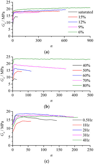From Figure 9, it can be observed that the shear modulus rapidly increases in the initial cycles. This is attributed to the vibration-induced densification process that occurs in the early stage of loading. Consequently, the shear modulus in the early stages of loading does not reflect the true strength of the specimen. Figure 9a shows that for unsaturated specimens, the shear modulus reaches a stable state after the rapid increase, indicating that the shear modulus remains constant during the cyclic loading process until dynamic failure. In contrast, Figure 9b,c demonstrate that the shear modulus gradually decreases after reaching its peak value for saturated specimens. This indicates that the shear modulus of saturated specimens decreases gradually during cyclic loading until dynamic failure. Therefore, during the cyclic dynamic loading process, the dynamic shear modulus of saturated specimens gradually decreases, leading to an increase in deformation, which is an important factor accelerating specimen failure. Additionally, higher water content is associated with lower shear modulus during cyclic loading, while higher density is related to higher shear modulus. The shear modulus exhibits no clear correlation with loading frequency, with the lowest values observed at a frequency of 1 Hz.