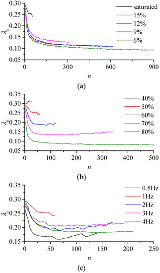 Figure 10 demonstrates that the initial damping ratio of the sand specimens under various conditions range from 0.26 to 0.3. With increasing cycle numbers, the damping ratio gradually decreases at a decelerating rate until reaching a stable value. However, the trend for specimens with 40% relative density is different. After the initial loading, the damping ratio exhibits a slow increase, but due to the low relative density, liquefaction occurs quickly. From Figure 10a it can be observed that, for unsaturated sand specimens, the damping ratio rapidly decreases with increasing cycle numbers. After 50 cycles, the damping ratio drops below 0.15 and gradually stabilizes. The final damping ratios of specimens with different water contents are relatively close, ranging from 0.08 to 0.13. Among them, the specimen with 6% water content has the lowest damping ratio, with a final value of 0.084. From Figure 10b, it can be seen that for specimens with different relative densities, the damping ratio decreases rapidly within the first 50 cycles, but there are significant differences in the final damping ratios. The final damping ratios for specimens with 50%, 60%, 70%, and 80% relative densities are 0.244, 0.198, 0.151, and 0.080, respectively. Therefore, the damping ratio during the vibration-induced liquefaction process of saturated sand is significantly influenced by the relative density. Figure 10c shows that, for specimens with different loading frequencies, the trend of damping ratio variation with cycle numbers is similar to other conditions. The damping ratio in the later stages of liquefaction ranges from 0.16 to 0.22, and its magnitude may increase or decrease with increasing loading frequency, without showing a clear correlation. Hence, during the cyclic loading until liquefaction process, the damping ratio of saturated sand is significantly higher than that of unsaturated sand. The damping ratio of unsaturated sand is independent of water content, and the damping ratio of saturated sand does not exhibit a clear correlation with loading frequency but decreases with increasing relative density.
