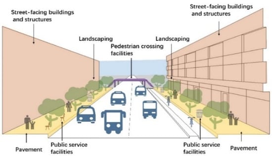 With the introduction of the complete streets concept, street pedestrian space has received renewed attention and generated a great deal of scholarly research [,]. In traditional street design concepts, the pavement is commonly used as a space for pedestrians, i.e., the ground space from the outer rimstone ramp to the boundary of the red line of the road []. In recent years, under the influence of the complete streets concept, research on street pedestrian space has focused more on the needs and perceptions of pedestrians. In subsequent studies, scholars have continued to expand and study the basic elements of street pedestrian space, including pedestrian paths, non-motorised paths, building setback spaces, amenity strips, safety separation spaces, public services and municipal facilities and landscape greenery, etc., and discuss them in categories according to the attributes of different streets [,].