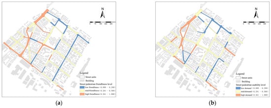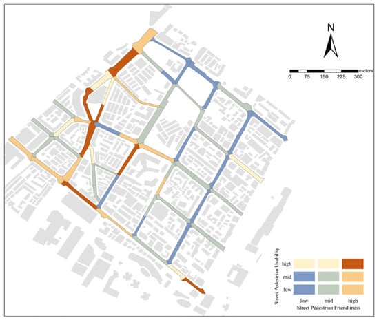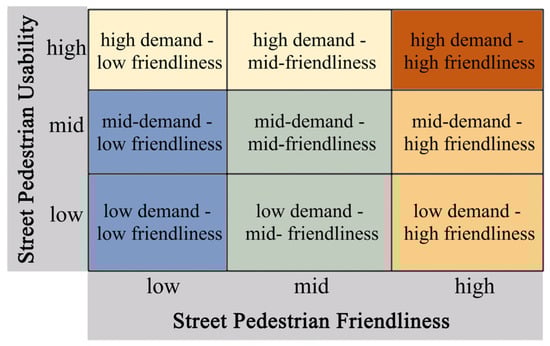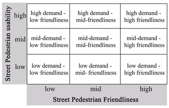 Matrix analysis is a quantitative multivariate statistical method that transforms multiple variables into a few composite variables by quantifying the relationships between distinct parts using data matrix diagrams []. The correlation and difference between the evaluation results of SPF and SPU are examined using matrix analysis in this paper. Meanwhile, SPF represents pedestrian friendliness and SPU reflects pedestrian demand. The natural breakpoint approach was used to construct the SPF–SPU matrix, which divided SPF and SPU into high, middle and low levels (Figure 2).