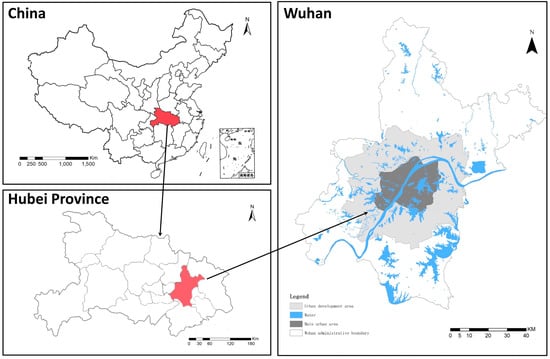 The research site is in Wuhan (113°41′−115°05′ E, 29°58′−22°31′ N). Wuhan is the capital city of Hubei Province and the central city of China. It is located in the eastern part of the Jianghan Plain and the middle reaches of the Yangtze River, where the Yangtze River, the third largest river in the world, and its largest tributary, the Han River, meet to form the towns of Wuchang, Hankou and Hanyang (Figure 3).
