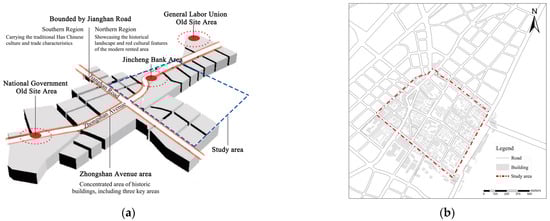 Location and overview of the study area: (a) Jianghan Road and Zhongshan Avenue Historic District Scope Diagram; (b) study area.