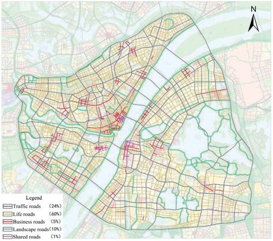 The Wuhan Urban Road Planning and Design Guidelines for All Elements (later referred to as the Guidelines) is a guiding code for street design with legal effect issued by the City of Wuhan []. The streets inside Wuhan’s Third Ring Road are classified according to the elements of street land use, street activities and natural landscape in Guidelines (Figure 5). The streets in the research region are divided into four types: living streets, transportation streets, business streets and shared streets, which include the majority of street types in Wuhan and are typical of the city.
