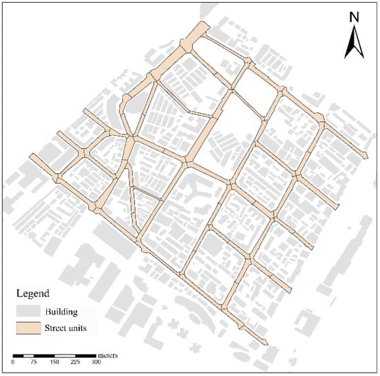 Long-distance urban roadways vary in various ways, including land use, road width, facility layout and traffic characteristics; therefore, their street pedestrian friendliness changes appropriately []. Therefore, it is necessary to further divide the long-distance streets so that a section of streets with similar characteristics is used as a study unit. The indefinite length method and the fixed length method are two common ways of dividing road sections. Considering the current situation of streets in the study area, the indefinite length approach is used in this work to split the streets inside the study region, and road sections with comparable features are treated as the same unit. The streets in the research region were classified into 67 street units based on several criteria, such as road junctions, land use and traffic forms (Figure 6). The length of each street unit spans from 65.98 m to 185 m, with an average size of 1626.30 . The street unit is used as the fundamental unit in this study to explore, measure and assess the street pedestrian friendliness.