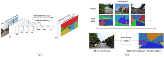 Street view image segmentation program structure and workflow []: (a) neural network structure; (b) neural network workflow.