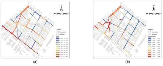 The results of the evaluation of street pedestrian safety indicators are shown in Figure A1. Only two street units in the study area have separate non-motorised lanes, with the average length of non-motorised lanes on both sides of the street accounting for 14.80% and 46.60% of the total length of the street unit, respectively, both of which are less than half of the total length of the street. They are concentrated in the shared streets on the north side of the study area. At the same time, the degree of pavement occupation ranges from 0.00% to 17.40%; i.e., 0–3 motor vehicles may encroach on the pavement for every 50 m of street space. Further, the commercial streets on the west side of the study area have the lowest level of encroachment and the lifestyle streets on the east and northeast sides have the highest level of encroachment. The pavement segregation safety index in the study area is mainly in the range of 0.786–0.924. Based on the segregation coefficient, it can be seen that the majority of streets use spatial segregation to raise the pavement by 5–10 cm to separate the pavement.
