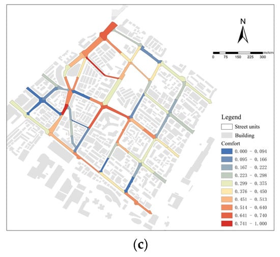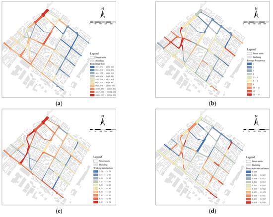 Figure A3 shows the results of the evaluation of street walking comfort indicators evaluation. The overall street interface permeability in the study area is greater than 44.10%, with the interfaces on both sides of the street space exhibiting penetrating and translucent interfaces. The sky visibility of most streets is distributed between 12.30% and 16.80%, and the visibility of the street sky is low, especially in the living streets on the east side of the study area. The pedestrian greenery and greenery coverage are distributed between 0.20–52.70% and 0.40–89.20%, with a maximum of 0.892 m2 of shade per 1 m2 of street in summer and a minimum of 0.004 m2. The commercial streets on the west and south sides of the study area have the worst performance in terms of greenery and greenery coverage. The pavement integrity is mainly distributed between 61.60% and 84.00%, with more than 60% of the length of the pavement on both sides of the street pedestrian space being kept intact and clean, neat and orderly.