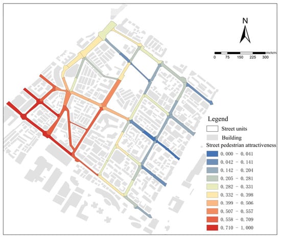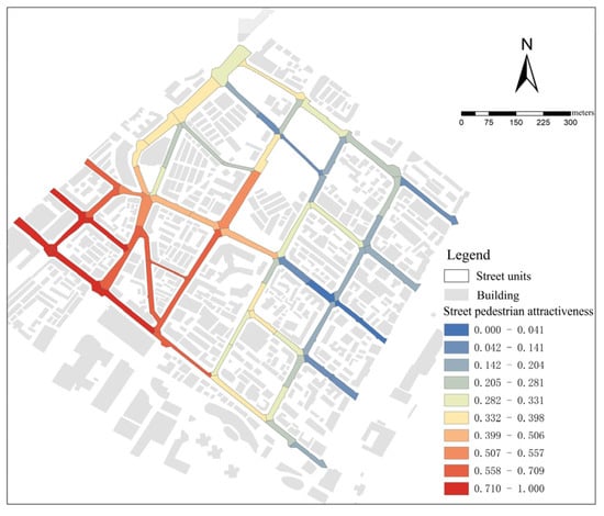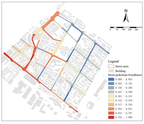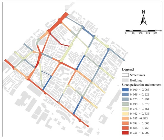 The comprehensive evaluation findings of the SPE were obtained based on the evaluation of safety, convenience and comfort, and the normalised scores are given in Figure 10. The scores of the street units are mainly distributed in the ranges of 0.298–0.461 and 0.537–1.000, with the SPE showing a relatively good performance. Shared streets such as Zhongshan Avenue on the west side of the study area have the highest SPE scores, while living streets on the east and northeast sides of the study area have the worst SPE performance.