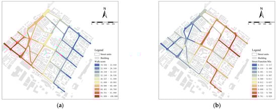 The spatial structure of the walking score shows a clear circle characteristic, with the score decreasing from the west side to the east side of the study area (Figure 11a). The spatial distribution of street function mix ranges from 0.353 to 0.829, with a low mix on the west side and a high mix on the east side, and a low mix of commercial and transport-oriented streets and a high mix of living and shared streets (Figure 11b).