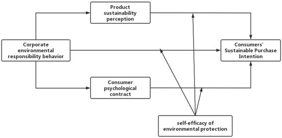 Although scholars have confirmed that consumers’ sustainable purchase intentions are influenced by sustainability perceptions and consumer psychological contracts, this degree of influence is not the same for all consumers and may be influenced by differences in individual consumer characteristics []; for example, the influence of corporate responsibility behavior on consumers’ purchase intentions is moderated by the degree of consumer trust and support [], and the individual’s own desire for knowledge, the pursuit of the individual’s desire for knowledge, and the pursuit of novelty are also important factors influencing green consumer behavior []. People’s efficacy expectations about their ability to achieve a certain outcome can provide motivation for action, and this efficacy expectation is self-efficacy []. The expectation and belief that consumers can solve environmental and resource problems through their own ability and consumption behavior is environmental self-efficacy [], which can provide motivation for sustainable purchase behavior. In this paper, consumer environmental self-efficacy is used as a moderating variable to analyze its impact on sustainable purchase intentions.