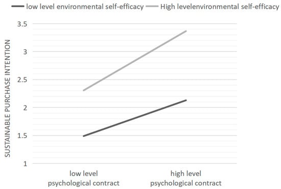- Examination of the moderating role of consumer environmental self-efficacy in mediating effects. A further analysis of the moderating role of consumer environmental self-efficacy in mediating effects used the Bootstrap program developed by Hayes (2013) and selected Model 14 for the data analysis. The results are shown in Table 3, where the interaction between consumer psychological contracts and consumer environmental self-efficacy was significant (β = 0.1051, SE = 0.0482, t = 2.1806, p < 0.05) and the interaction between product sustainability perceptions and consumer environmental self-efficacy was not significant (β = 0.0266, p > 0.05). H4a did not hold, the possible reason for this being that consumers with a high environmental self-efficacy usually have a higher education level and higher overall quality. In this experiment, 74% of high environmental self-efficacy consumers with university Bachelor’s or college degrees or above, when faced with the information of product sustainability attributes, easily attributed this to the marketing means of the product, which affected their purchase intentions. Thus, the relationship between product sustainability perceptions and sustainable purchase intentions is not affected by consumer environmental self-efficacy. The next paper further analyzes the moderating effect between psychological contracts and sustainable purchase intentions using a simple slope diagram based on the results of PROCESS 3.0, as shown in Figure 3. For subjects with a high consumer environmental self-efficacy, consumer psychological contracts had a significant positive effect on their sustainable purchase intentions, while for subjects with a low consumer environmental self-efficacy, consumer psychological contracts also had a positive effect on their sustainable purchase intentions, but this effect was weaker and smaller than that of the subjects with a high consumer environmental self-efficacy. This shows that, under a certain level of consumer psychological contract, the effect of the consumer psychological contract on sustainable purchase intentions gradually increases as the level of individual consumer environmental self-efficacy increases, verifying H4b.Table 3. The moderating role of consumers’ environmental self-efficacy in the mediating effect.Figure 3. The moderating role of consumer environmental self-efficacy between consumer psychological contract and sustainable purchase intention.