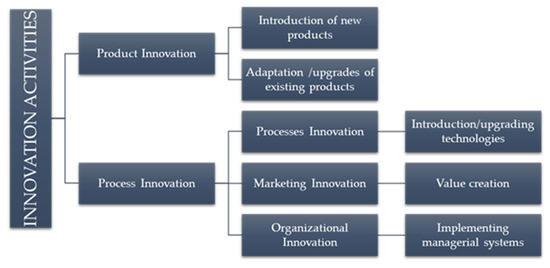 Innovation capacity contributes to improving the firm’s performance through two innovation activities (Figure 1), either by introducing new innovative products that temporarily enhance the market position or by the innovation of process that allows the profit to persist as it transforms the internal capabilities of the company [44,45]. The latter is divided into three activities: process innovation, marketing innovation, and organizational innovation [31].