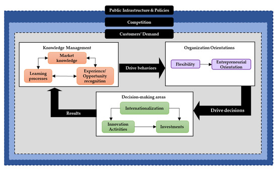 The development of innovation capacity may be slow due to a lack of resources and exposure to increased risk [18]. In the same venue, public infrastructure and policies, market environment, and competition, as external factors, influence firms’ decision-making while planning their innovation strategies and internationalization processes [21,31,32]. SMEs’ entrepreneurial orientation enables them to overcome these limitations and enhance innovation capacity and internationalization [33,34,35,36]. Likewise, flexibility is recognized as a capability that SMEs use to cope with their lacks and environmental uncertainty while improving their innovation capacity and internationalization process [6,24,25,37]. Therefore, innovation performance and internationalization of SMEs are subject to both company-specific factors and systemic factors [38]. While there is a real relationship between innovation and internationalization, it is not clear which leads to the other [39,40,41].