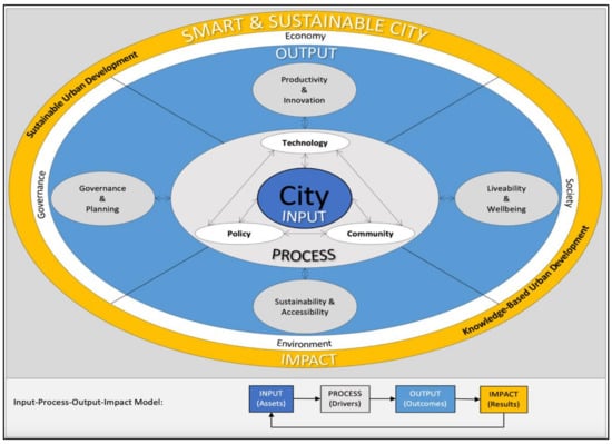 Smart city is a multi-faceted concept; however, the main available studies focus on key domains or provide global rankings, e.g., cities in motion [30], European digital city index [31], innovation city index [32], smart city strategy index [33], global cities index [34], and global livability index [35], easy parks’ smart city index [36], and the top-50 smart city governments index, developed by Eden Strategy Institute and ONG&ONG [37]. Although they present relevant methodologies for an overview of the evolution of Smart Cities in different places on the planet, such reports do not present a holistic perspective of the performance of smart cities or even their development potential. Therefore, we adopted a comprehensive smart city assessment model—the smart city assessment model—whose systemic foundation is based on the conceptual framework of smart cities. The model evaluates the achievements of smart cities and urban regions with a large base of multivariable indicators according to the conceptual perspective presented in Figure 2. This methodology was adopted in 2020 to analyze cities in Australia and proved to be valid for evaluating the performance of smart cities in relation to the proposed set of indicators [38].