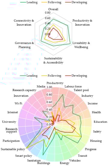 Although the Following BCCs perform statistically significantly higher compared to the developing cities, the BCCs located in the developing cluster do not necessarily perform lower in all categories compared to those in the following cluster. This information is confirmed by analyzing Figure 3, which shows that the developing cluster is relatively close to the Following BCCs in four of the six study categories (productivity and innovation, livability and wellbeing, sustainability and accessibility, and connectivity and innovation).