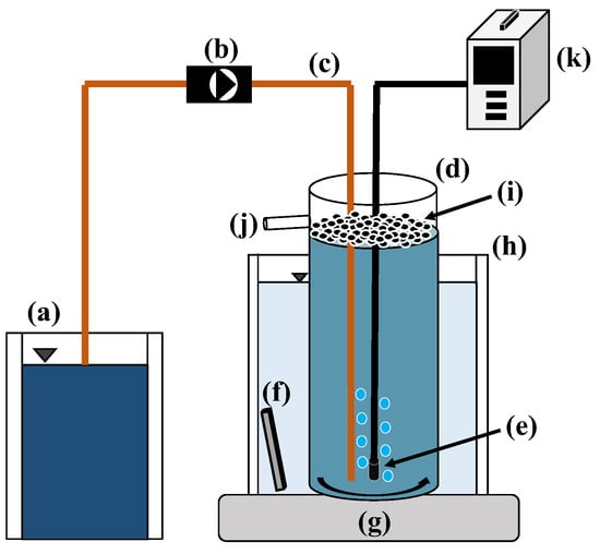 Schematic diagram of the experimental setup, including (a) synthetic wastewater feeding tank, (b) peristatic pump, (c) influent pipe, (d) HD reactor, (e) air stone diffuser, (f) heating rod, (g) magnetic stirrer, (h) water bath, (i) plastic beads, (j) effluent pipes and (k) H2 generator.