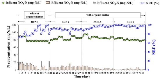 At the beginning of the experiment (RUN 1), in the absence of OM contamination, both parameters exhibited higher levels in the treated water, leading to an unstable NRE during this phase. In accordance with the experimental details, varying concentrations of OM ranging from 1500 to 5000 mg COD/L were subsequently introduced into the reactor for RUN 2–4. The results showed that, in RUN 2, with an initial COD concentration of 5000 mg/L, some NO3-N concentrations remained incomplete, ranging from 10 to 15 mg/L in the effluent. However, in RUN 3–4, where a lower initial COD concentration in the range of 1500–3000 mg/L was utilized, high ranges of NRE approached close to 100%, and the concentrations of effluent NO3 and NO2 were nearly zero after day 50. This improvement may be attributed to the gradual adaptation of the bacteria in the reactor to these activities when exposed to organic pollutants. The results indicate that bacteria were more effective in reducing NO3 and NO2 at low COD dosages [29]. Thus, a small amount of organic carbon sources might be suitable for denitrification in this reactor.