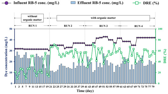 RB-5 dye concentrations and decolorization efficiency (DRE) in RUN 1–4.