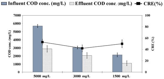 Average values of COD concentrations and COD removal efficiency (CRE).