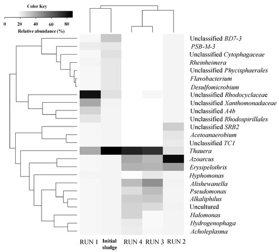 Heatmap illustrating the compositions of bacterial communities at the genus level during different operation times (expressed as relative abundance in percentage) for RUN 1–4.