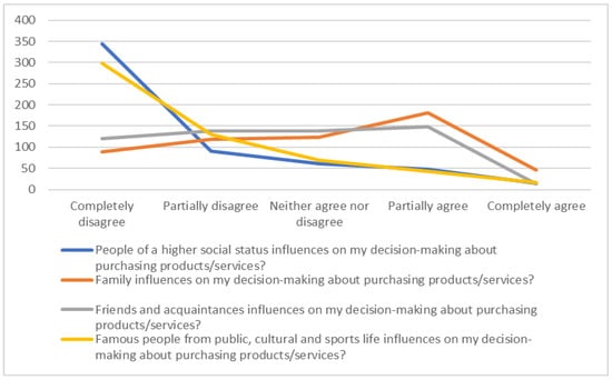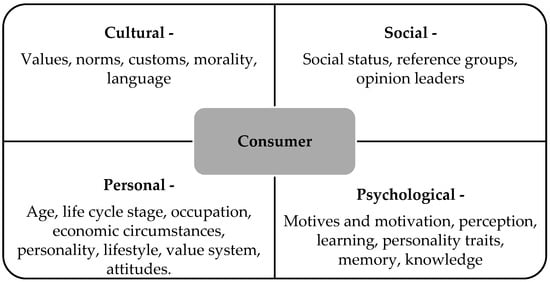 Consumer habits are greatly influenced by internal and external factors. Internal factors comprise economic conditions and psychological factors while external ones comprise social and cultural factors []. The consumer habits are subject to constant environmental influences. There are daily influences of family, friends, the Internet, social networks, famous public life personalities, and the media on purchase decision-making. Even small things affect consumer perception, ranging from the way of buying and delivering products, to insurance and complaints, after-sales services, and everything that can be classified in the category of marketing mix (product, price, distribution, and promotion).