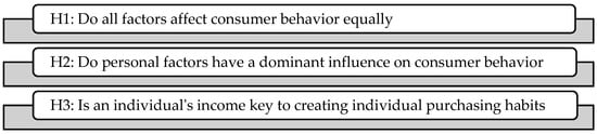 In this study, we set up hypotheses to test whether all the factors influencing consumer behavior have an equal impact or whether some of them dominate. For this purpose, three hypotheses were tested: H1: Do all factors affect consumer behavior equally? H2: Do personal factors have a dominant influence on consumer behavior? H3: Is an individual’s income key to creating individual purchasing habits?