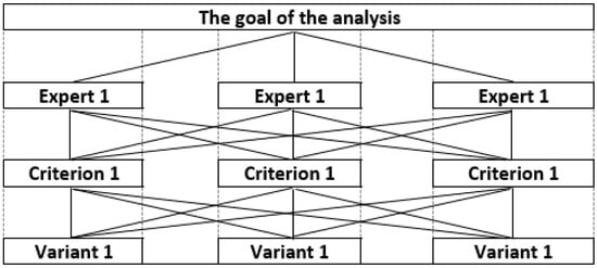 Saaty’s scale is used for pairwise comparisons of target-related criteria and then pairwise comparisons of the variants related to each criterion. A scale of comparison allows the decision-maker to incorporate the experience and represent the relationship between the elements of a hierarchical structure.