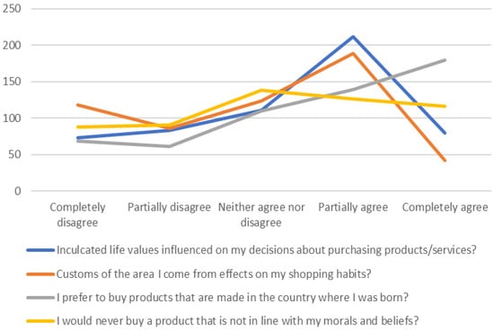In their research, Al-Ghaswyneh; Lawan et al.; and Nawawi et al. [,,] indicated that cultural factors have a significant effect on one’s buying decision. The study of Etuk et al. [] indicates that that family, reference groups, and culture have a significant positive influence on the decision-making process regarding purchases.