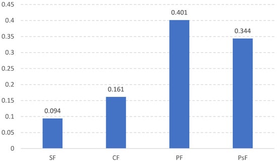 where CR is the consistency ratio, CI is the consistency index, and RI is the random consistency index. According to Saaty [], if the value of CR is less than or equal to 0.1, it represents an acceptable range. (Statistical data are available on request: pairwise comparison, standardized matrix, and CR and CI worksheets.)