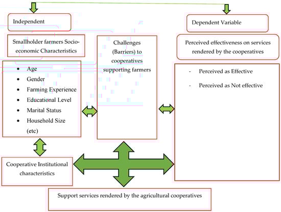 Based on the reviewed literature above, a hypothetical synthesized summary of a flow chart was developed as shown in Figure 1. The chart is divided into two basic components, classified as independent and dependent. The independent variables in the synthesized diagram are the smallholder farmers’ socioeconomic characteristics such as age, gender, marital status, position held, average annual income, education level, etc. The relationship that occurs between the socio-economic characteristics of the smallholder farmer and all other variables, namely, the institutional characteristics and the challenges that the agricultural cooperative may be facing, will ultimately determine the support services farmers receive. These support services may include factors such as access to credit, inputs, labour force, markets, etc., and they are expected to be tailored to the farmers’ needs. The perception of the effectiveness of these cooperatives by the smallholder farmers, which is the dependent variable in the study, will ultimately be determined by the question as to whether the cooperative society can provide adequate support in meeting farmers’ felt needs or not by the support services they are able to render.