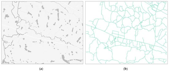 The construction of the axis model of the research area. (a) Data on regional road distribution; (b) the road axis model of the study area.