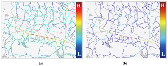 First, based on spatial syntactic analysis, the location integration and choice degrees of roads in the studied region were obtained. The road data of the study area were fed into Auto CAD (Autodesk Computer Aided Design 2021) to build an axial model of the study area [42,43], as shown in Figure 3, which was then imported into Depthmap (Beta 1.0 2012) for quantitative analysis to compute the degree of location integration [44] and the choice [45] of roads in the study area. The warmer the axis color (tends to be red), the higher the location integration degree and choice degree. Cooler axis colors (favoring blue) represented lower location integration and choice, as shown in Figure 4. The higher the degree of location integration (n = 3), the greater the possibility of children’s travel choice within 1000 m of the road. The higher the degree of choice, the more likely the road was to be crossed by traffic and people.