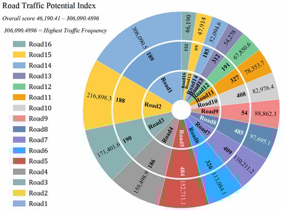 Based on spatial syntax, linear regression analysis, and the information weighting method, we calculated the potential travel frequency of independent roads for left-behind children in the study area.