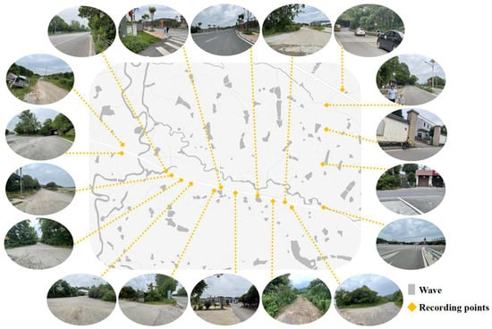 Finally, the weight of location integration was 0.7998 and the weight of choice was 0.2002 by means of the information weight method, as shown in Table 3. According to the weight value, the location integration and choice of 40 axes were supernaturally calculated, and the 16 roads with the highest passing frequency for left-behind children in the study area were obtained, as shown in Figure 5. In addition, the perspective of child walkers with a height of 1.2 m was taken for travel to the study area. Field images of the most frequented roads were obtained every 200 m, as shown in Figure 6.