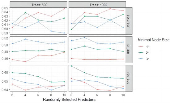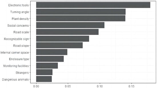 The results show that our constructed learning model works well with Receiver Operating Characteristic Curve (ROC) and Area Under Curve (AUC), and the optimal hyperparameters are mtry = 2, minnode = 21, and trees = 1000 (Figure 7 and Figure 8). The weights of the road safety perception factors are dangerous animals: 0.024532451; strangers: 0.025875346; monitoring facilities: 0.034379649; enclosure type: 0.043407716; internal corner space: 0.049189569; road slope: 0.07319653; recognizable signs: 0.083148354; road scale: 0.098218569; social concerns: 0.107460235; plant density: 0.140429783; turning angle: 0.140834306; and electronic tools: 0.179327493 (Figure 9 and Table 9).