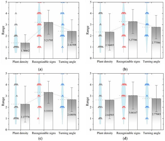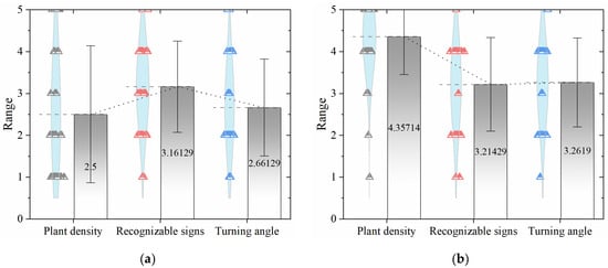 Based on the vision permeability analysis, as shown in Figure 10 and Figure 11, it was found that the mean value of the child’s assessment of the plant density index was 1.38462 and the mean value of the guardian’s assessment was 4.35714, showing a significant difference. The mean was 2.2778 to 2.64583 for children of different genders and ages, with no significant differences. Second, the mean value of the recognizable signs index evaluated by children and guardians was 3.21429 and 3.21795, with no significant differences. The mean was 3.16129 to 3.33333 for children of different genders and ages, with no significant difference. Moreover, the mean value of the turning angle index was 2.42308 for children and 3.2619 for guardians, showing a significant difference. The mean for children of different genders and ages was 2.66129 to 2.77586. There was no significant difference.