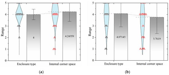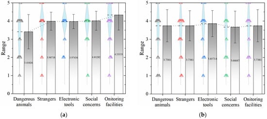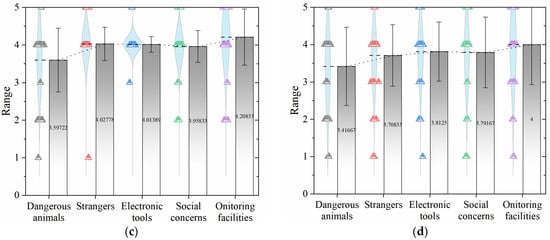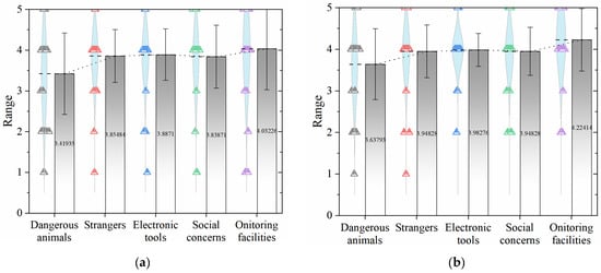 Based on the neighborhood shelter analysis, as shown in Figure 16 and Figure 17, it was found that the mean value of the child and guardian’s assessment of the dangerous animals index was 3.1026 to 3.7381. The average stranger score was 3.7381 to 3.98718. The average electronic tools score was 3.85714 to 3.97436. The average social concerns score was 3.6667 to 4.01282. The average monitoring facilities score was 3.7383 to 4.333, and the difference was not significant. In addition, the mean value of the dangerous animals index assessment for children of all genders and ages was 3.41935 to 3.63793, the stranger index was 3.70833 to 4.02778, the electronic tools index was 3.8125 to 4.01389, and the social concerns index was 3.79167 to 3.95833. The mean value of the monitoring facilities index was 4 to 4.22414. The mean values tended to be essentially the same, and there were no clear differences.
