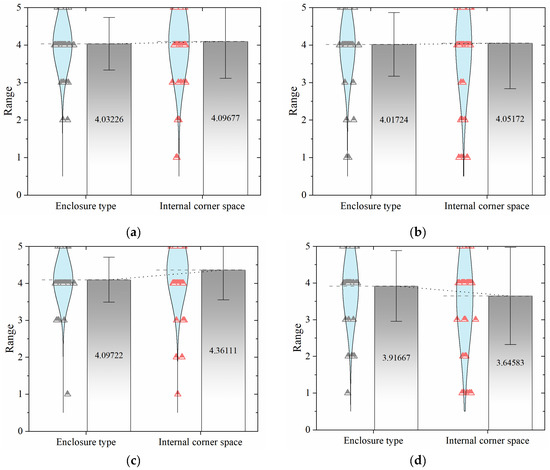 A step-by-step regression analysis was performed on 80 offline questionnaires with the choice of road insecurity in the study area for left-behind children and their guardians as the dependent variable and their assessment of factors affecting road safety as the independent variable. The regression coefficient p value of the internal corner space index was less than 0.05, which produced a significant negative correlation (Table 8).