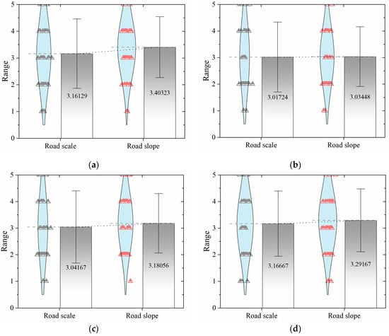 In summary, there was a significant difference in the mean value of evaluation between left-behind children and their guardians. For plant density, turning angle, enclosure type, and road scale, the road safety perception of left-behind children was higher than that of their guardians. In addition, there were some non-significant differences in the mean values of the assessments among children of different genders and ages. For enclosure type, left-behind children aged 6–12 had a higher perception of safety than left-behind children aged 13–16. Among left-behind children of different ages and genders, the safety perceptions of the dangerous animals, strangers, electronic tools, social concerns, and monitoring facilities indicators were different. Left-behind children aged 6–12 had higher security perceptions than left-behind children aged 13–16, and male left-behind children had lower security perceptions than female left-behind children.