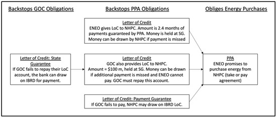 Figure 2 illustrates the payment guarantee. Reading the diagram from right to left, the Power Purchase Agreement obliges ENEO to buy energy from the NHPC. The uppermost Letter of Credit (LoC) is 2.4 months of PPA payments held in escrow at Society General (SG) bank. If that account is exhausted, the GOC also has an LoC of $100 million, which may be drawn. Finally, if the GOC fails to pay the NHPC, then the IBRD guarantees that payments will be made.