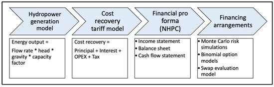 The series of linked models functioned to (1) estimate electricity volumes for NHP; (2) derive an annual cost recovery tariff; (3) produce a pro forma financial report for NHCP, forecasting costs and revenues for the concession of 35 years; and (4) evaluate the financing arrangements through a systems lens using (i) a series of Monte Carlo simulations to evaluate the sufficiency of the guarantees, in light of risk events, (ii) binomial models to assess the value of the banks’ options, and (iii) a swap model to evaluate the interest rate swap. Figure 4 illustrates modeling the sequence.