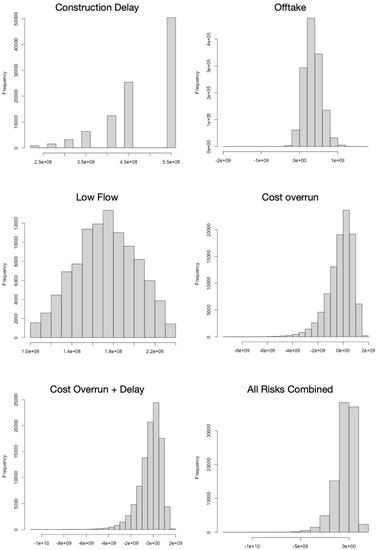 We evaluated the probabilistic impacts of four sources of risk—cost overruns, scheduling delays, reduced offtake, and low flow due to climate change—on financial outcomes. While there are many risks associated with a project of this size, these four represent the financial manifestation of most of them, as discussed in Section 2.2. We then combined the risk factors to understand the effects of simultaneous impacts. For each risk, and the combinations, a Monte Carlo simulation was performed, with 100,000 runs as described in [24]. Graphical results and discussion are presented in the next section. The goal of the simulations was to discover the full range of possible NPVs, based on the statistical behavior of the risk factors. The Monte Carlo simulations randomized the source of risk within the pro forma model and kept track of the resulting NPV values. The inputs are randomized according to a probability density function, which is defined by an average (mu) and a standard deviation (sigma). Starting values for the inputs are also required. For cost overruns, the capital cost of the project was used as a starting point, and the mu and sigma values were 0.40 and 1.25, respectively [21]. Simulating project delays involved randomizing the number of years for construction from 4 to 10, with 4 being the expected construction timeline and 10 an extreme possibility. The probability of a four-year construction period was assumed to be 50%; probabilities for each subsequent construction time decreased by half. To evaluate reduced offtake, annual energy volumes were simulated downward from a starting value of 684,167,794 GWH, using a mu of −0.0309 and sigma of 0.1129. These values were derived from historical, technical and commercial losses of ENEO. Finally, to model possible flow reduction at the site, the historical flow at Nachtigal was used as a starting point. Grijsen [41] estimates the most significant climate change impacts on the Sanaga River would be a reduction by 22% on the negative side, and an increase by 5% on the positive). Importantly, we held the tariff constant in the model; in actual operations, the tariff would be adjusted upward to cover cost increases. Other assumptions can be seen in the Appendix A. To evaluate the guarantees, we then compared the risk-impacted NPVs with the coverage amounts provided by the guarantees.